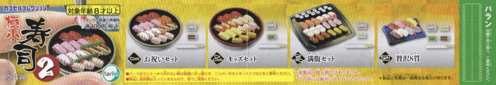 約2年前の2024年6月26日にターリンから発売された「極小寿司」が装いも新たに「極小寿司2」となって生まれ変わりました。彩色が豪華になり、前回と同様に全4種類のラインナップで可動フィギュアに合わせて遊べる1/12スケールのミニチュアとなってます。