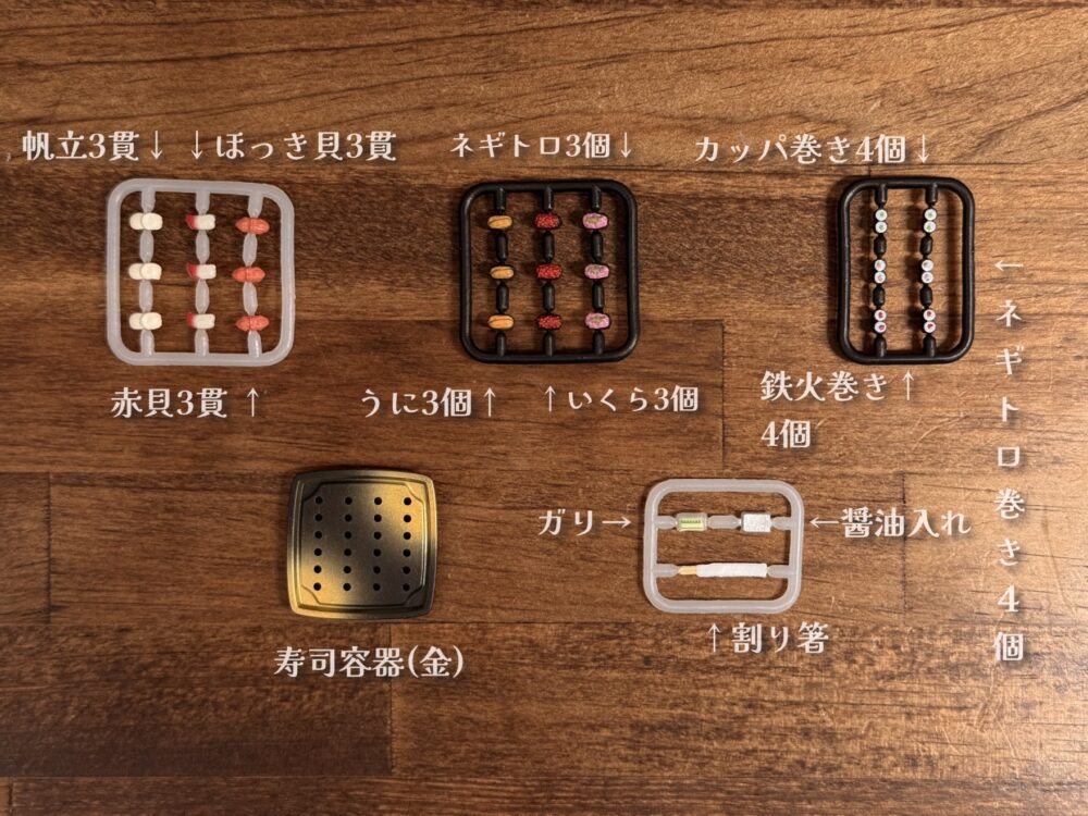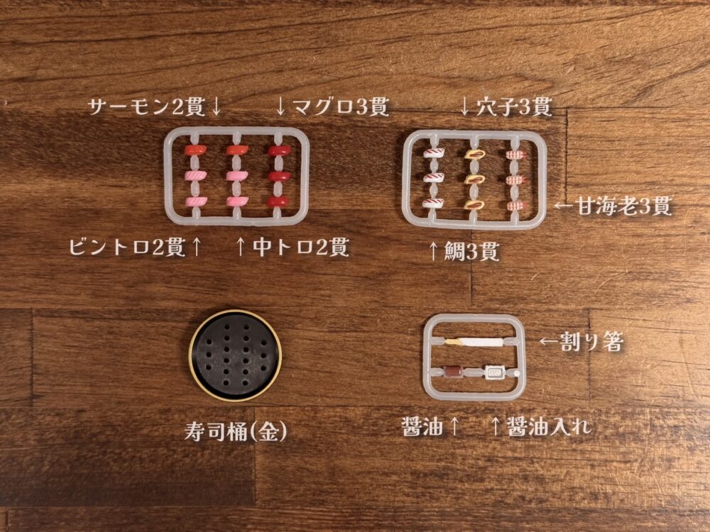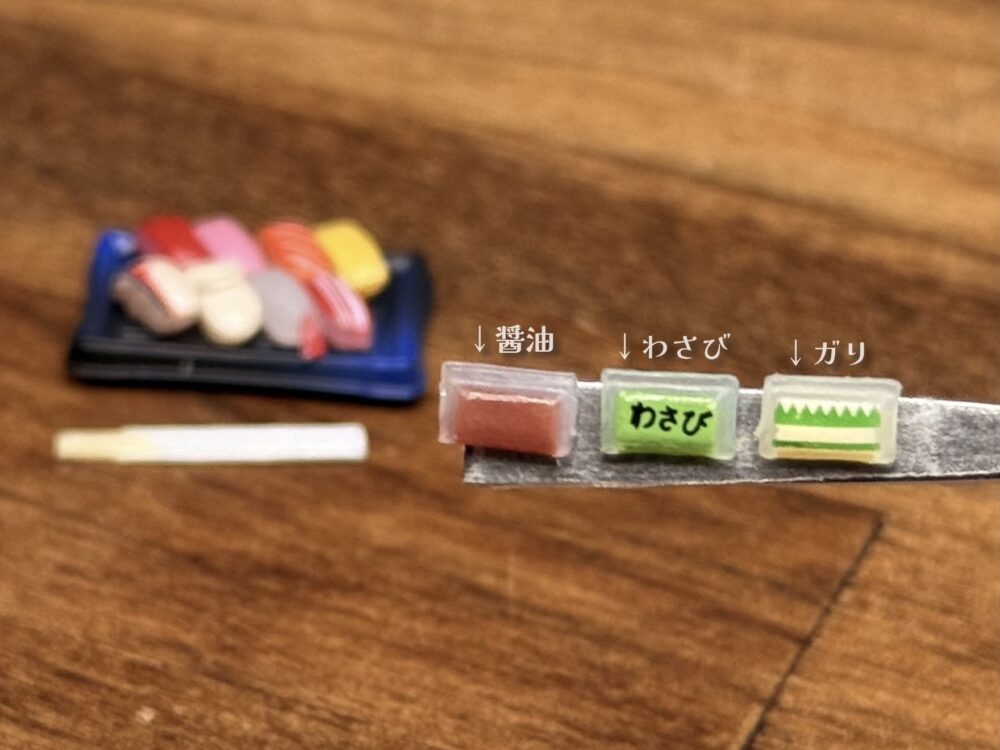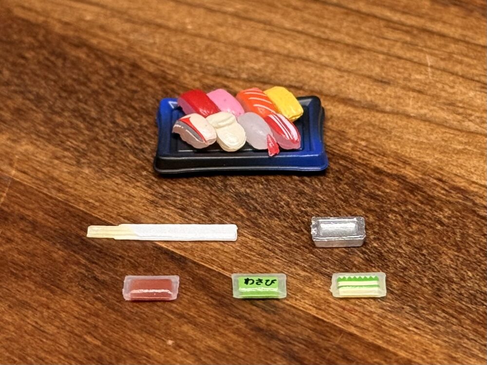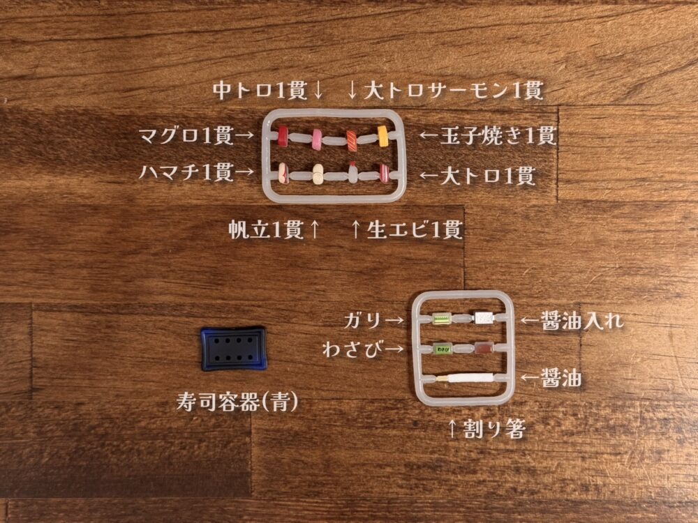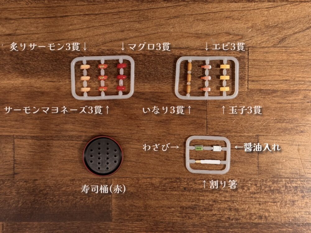 寿司パーツ数は全4種類の中で1番少ないですが、こちらには他のラインナップに入ってた寿司以外の醤油・わさび・ガリの3種類が全て入っています。