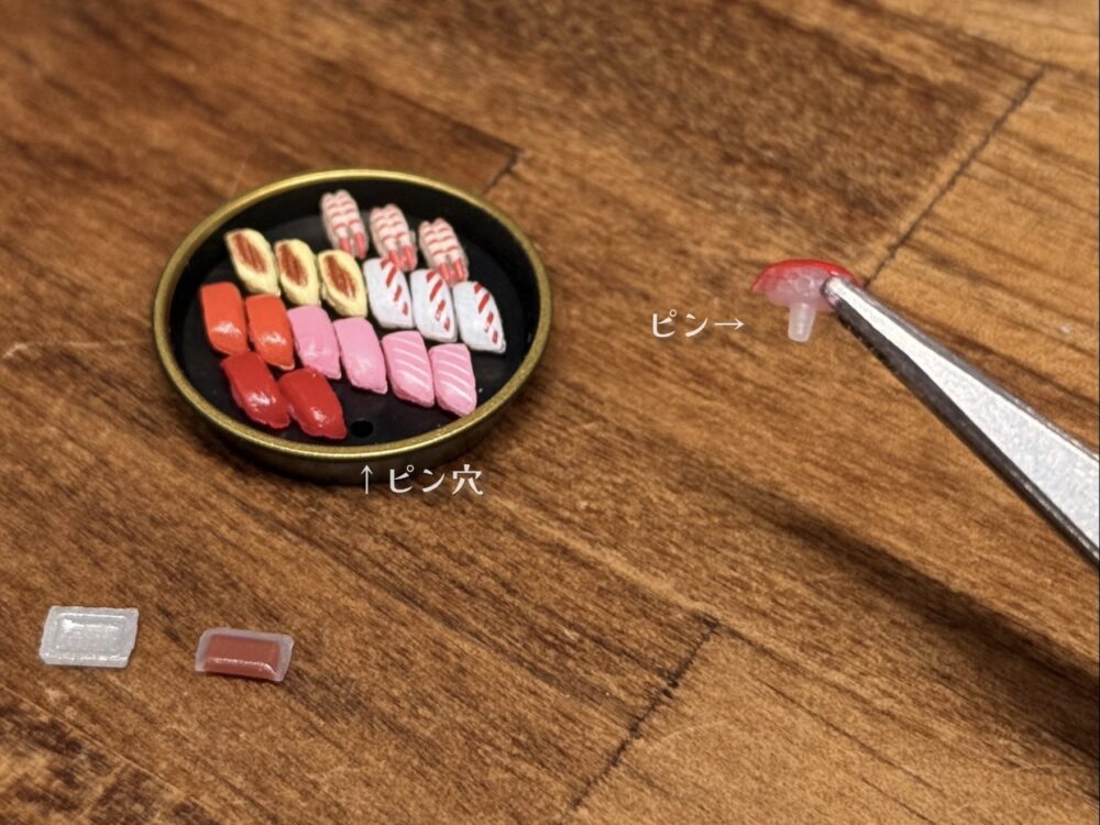 寿司の底面がピンになっていて寿司桶の方にピン穴があるので綺麗に並べる事ができます。テーパーピンになっているので差し込んだ後にちゃんと押し込むとそれなりに保持されます。