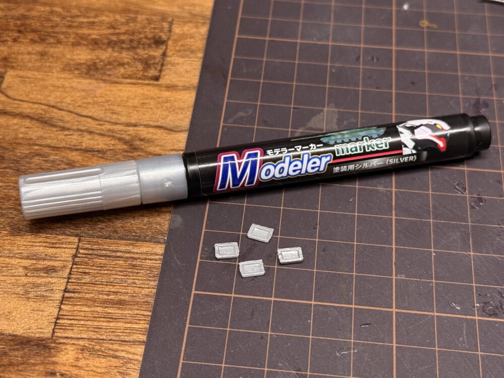 続いては醤油入れの塗装です。よく見ると4個中1個はシルバー塗装の色のりが良いですが他のが薄いので、100円ショップで購入したこちらのモデラーマーカーで塗ります。