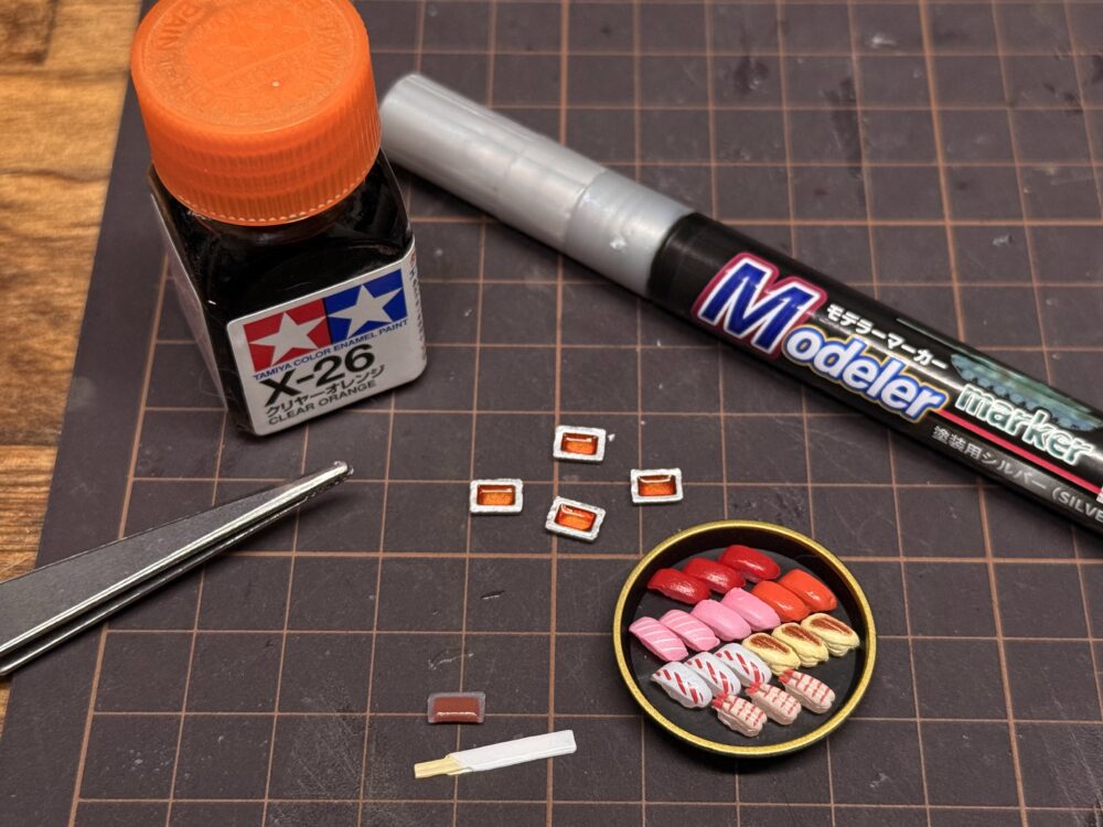 モデラーマーカーで塗った後に醤油入れの中にエナメル塗料「X-26クリヤーオレンジ」を塗って仕上げました。塗るというよりか竹串などの細いモノで数滴滴らしただけ。